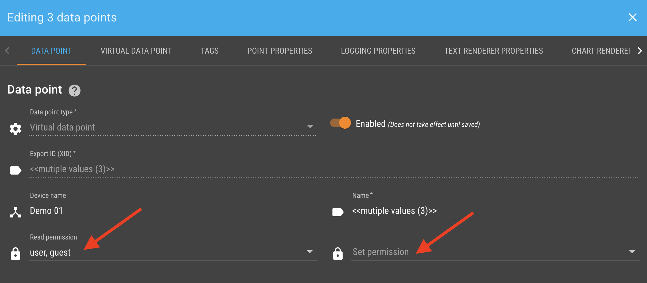 To add user permissions to Data Points you can use the Bulk Data Point Edit page or the Data Source edit section. Here you can add Read permissions and Set permissions to multiple data points.